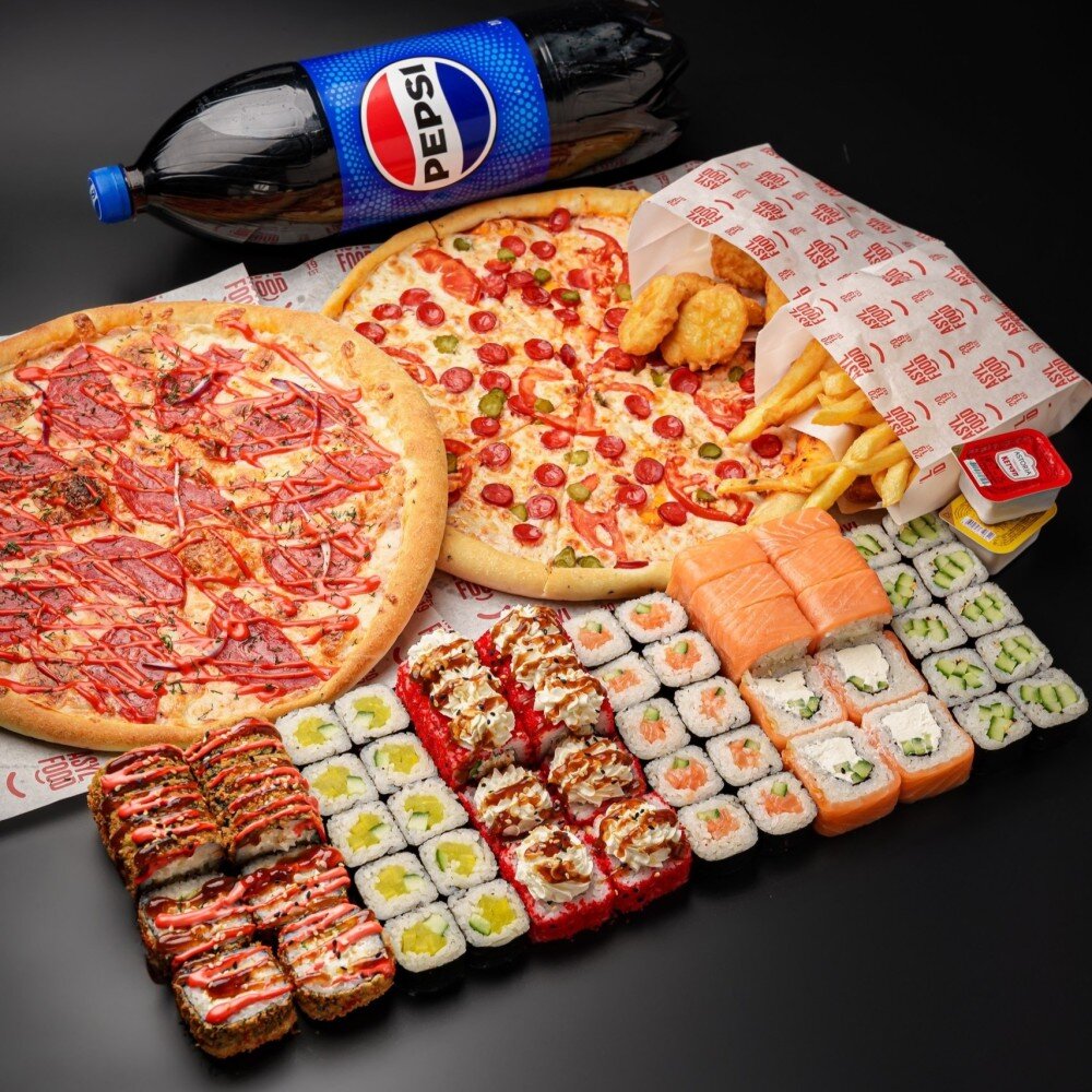 филадельфия, сочи, кани темпура, каппа маки, сяке маки, такуан маки, пицца «домашняя», пицца «охотничья», картофель фри+соус, наггетсы+соус, пепси 2л