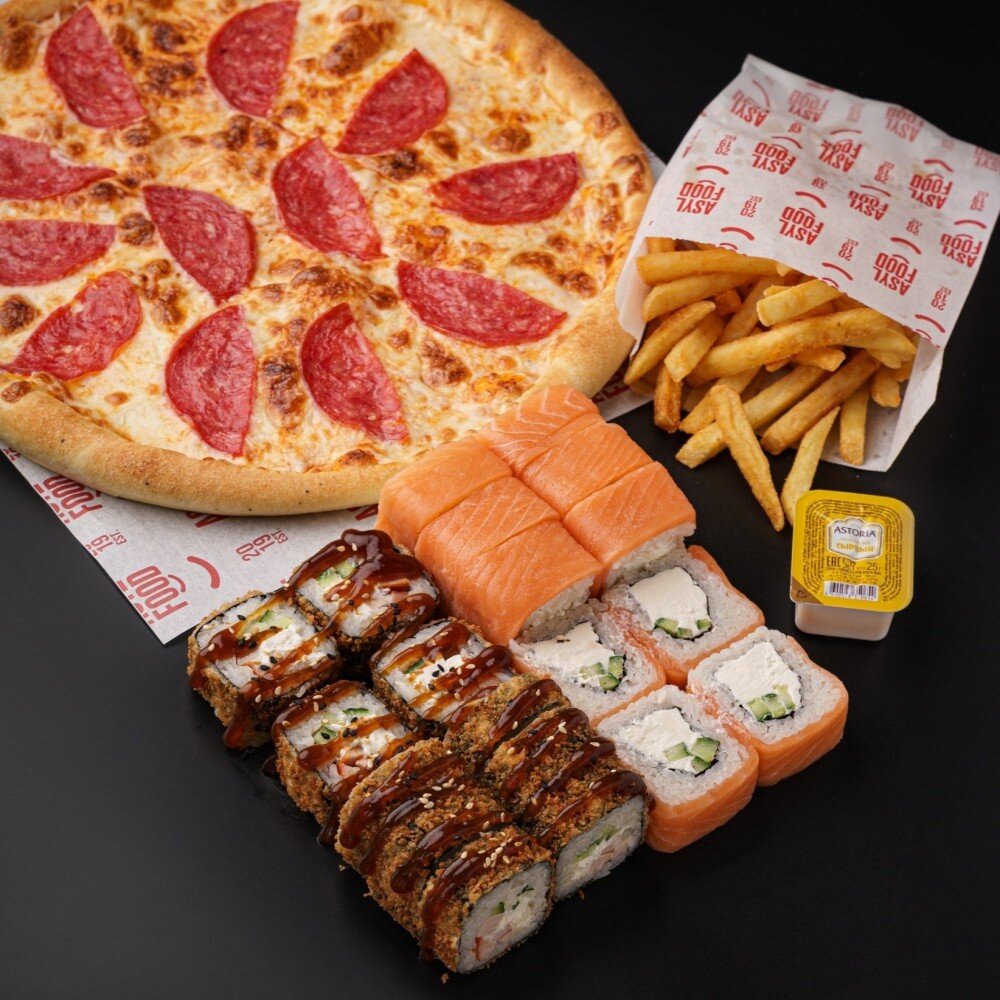 филадельфия, чикен темпура, пицца «с колбасками», картофель фри+соус